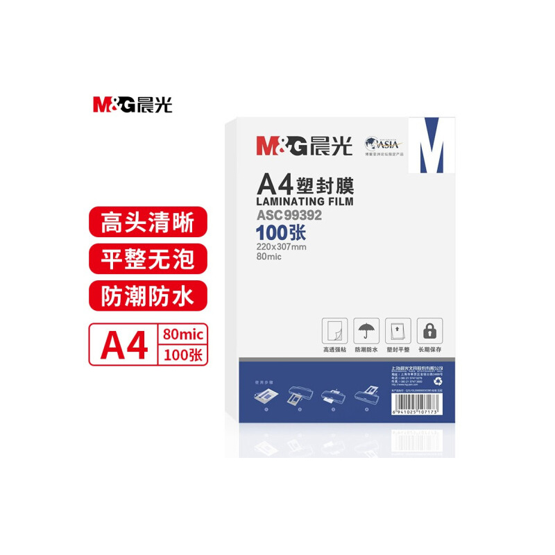 晨光(M&G) A4/100张 80mic透明高清塑封膜 220*307mm 自营