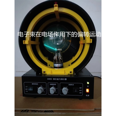 产品由洛仑兹力管、励磁线圈、控制及电源暗箱四部分组成。洛仑兹力管为直径160mm的大玻璃泡,泡内抽真空后,充入一定压强的混合惰性气体,玻璃泡内装一个特殊结构的电子枪,由热阴极、调制板、锥形加速极组成,还有一对偏转板;励磁线圈即亥姆霍兹线圈,由一对直径为280mm,每只匝数为140匝的环线圈组成,两线圈同轴平行放置,间距140mm,两只线圈串联连接;控制及电源组合部分在控制面板上设有偏转电压幅值旋钮、偏转板电压方向开关、加速极电压调节旋钮、励磁电流方向开关、励磁电流幅值旋钮、电源开关、电源指示灯等;产品主要技术参数:1、加速极电压0~250V连续可调;2、励磁电流 电流方向:顺时、断路、逆时三档,电流幅值:0~2.5A连续可调;3、偏转板电压 电压方向:上正、断路、下正三档,电压幅度:50~250V连续可调;4、洛仑兹力管转动角度>180°,有刻度指示;5、电源:220V±10% 50Hz;6、功耗:45瓦;7、连续工作时间:1小时;仪器外形尺寸约350×300×450mm。